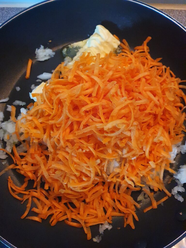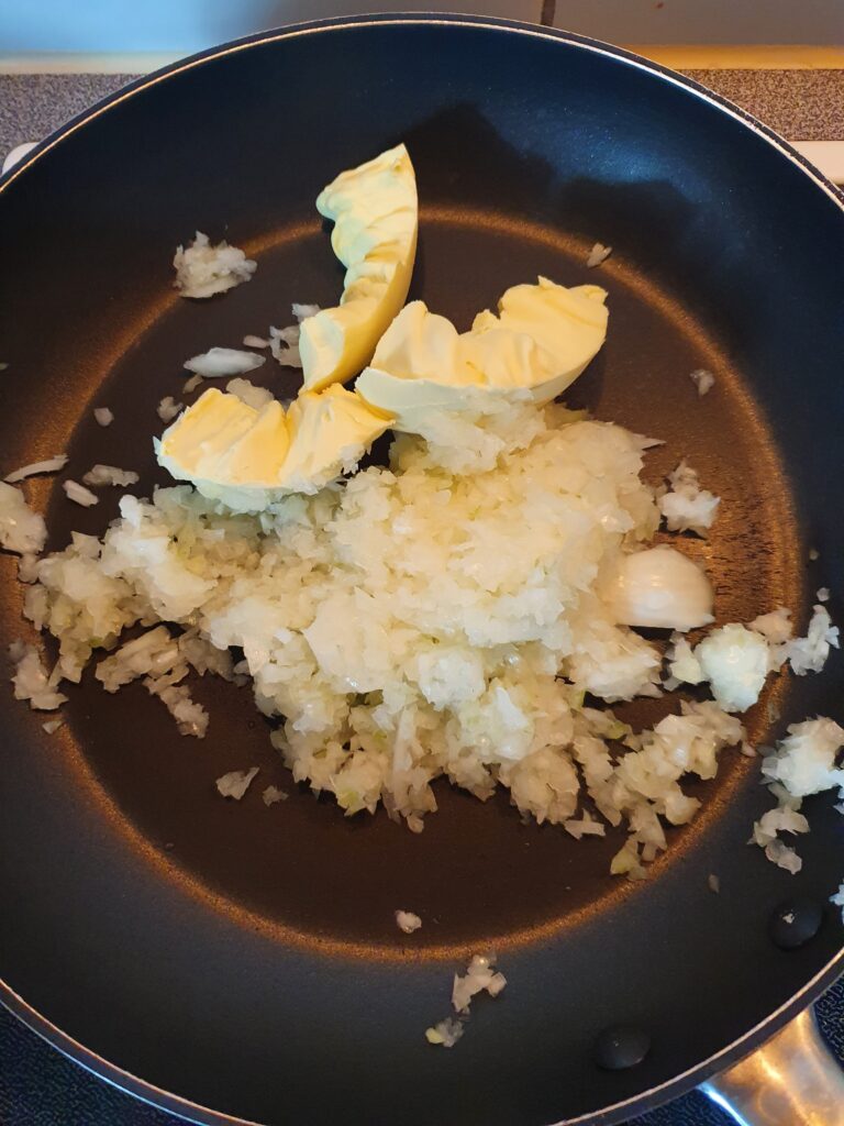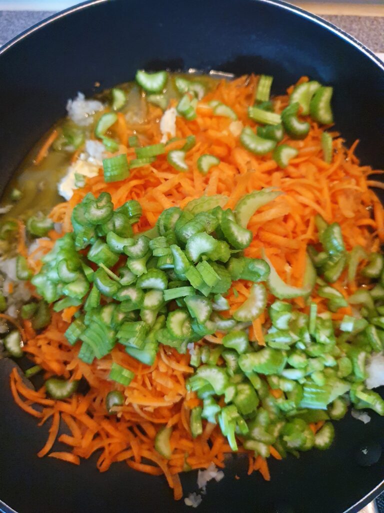 Das Wichtigste an einer Bolognese ist das sogenannte “Soffritto”: Dazu einen ordentlichen Klotz Butter (ca. 125 g) und ein wenig Olivenöl (damit die Butter nicht verbrennt) in eine Pfanne geben. Zwiebeln, Möhren und Staudensellerie putzen bzw. schälen, ganz fein hacken und auf möglichst niedriger Flamme langsam (mind. 30 Minuten) darin garen, bis das Gemüse schön glasig und weich geworden ist. Wichtig ist, dass das Gemüse nicht brät, sondern wirklich nur dünstet – also nicht zu heiß werden lassen!