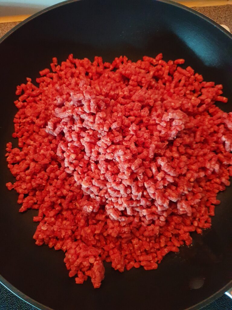 Derweil das Rinderhackfleisch so lange in einer weiteren Pfanne scharf braten, bis es anfängt zu karamellisieren. Anschließend mit einem Schuss Weißwein ablöschen, sodass sich alles Angebackene vom Boden lösen lässt. Wichtig: Jetzt je nach Saucenmenge ca.1/4 bis 1/2 Liter Milch hinzugeben, die sich um das Hackfleisch legt und diesem einen ganz milden Geschmack verleiht.