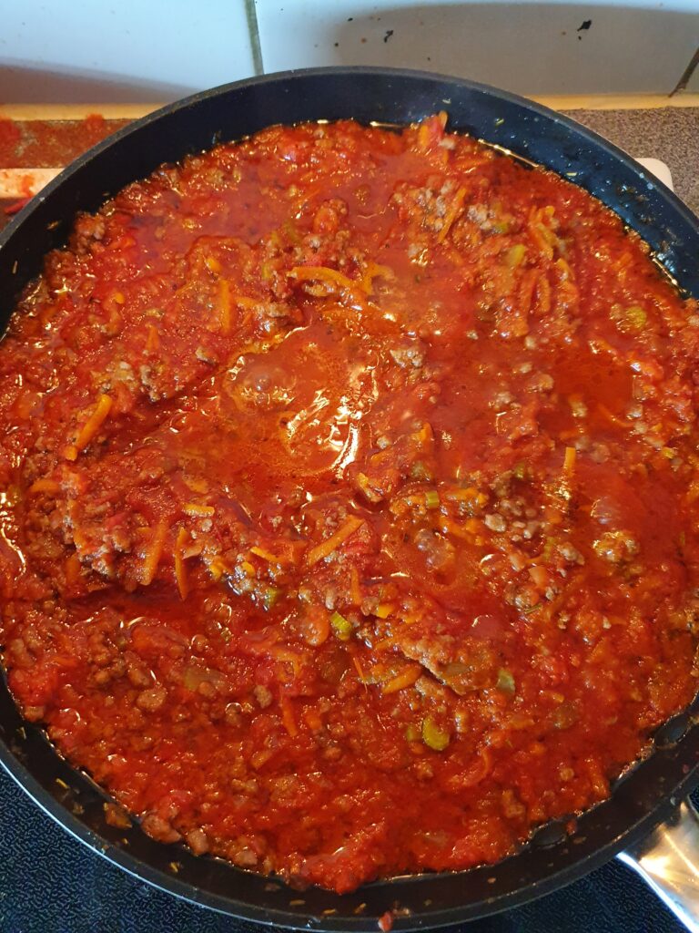 Sobald das Fleisch mit Weißwein und Milch aufkocht, die Tomatensauce hinzugeben. Sobald dies alles wieder aufgekocht ist, den “Soffritto” hinzugeben. Der in Scheiben geschnittene Knoblauch und die zerstampften Peperoncini können jetzt auch mit hinein. Die Bolognese kann dann gar nicht lange genug köcheln. Ideal wären ca. 5 Stunden. Mindestens 2 Stunden sollte sie aber köcheln.